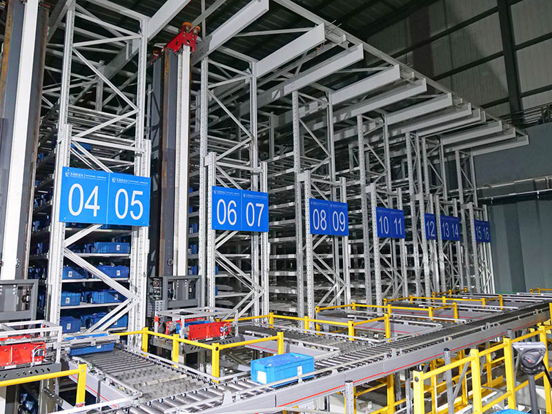 The warehouse logistics center is equipped with a Miniload system featuring 7 aisles, consisting of 6 single-deep storage locations and 1 double-deep storage location, providing a total of over 80,000 storage bins. This Miniload system connects directly to each workshop, handling the storage of raw materials and semi-finished products as well as their distribution to the production lines. Additionally, the warehouse logistics center is designed with inbound and outbound systems on every floor to facilitate seamless connectivity with the adjacent production workshops.