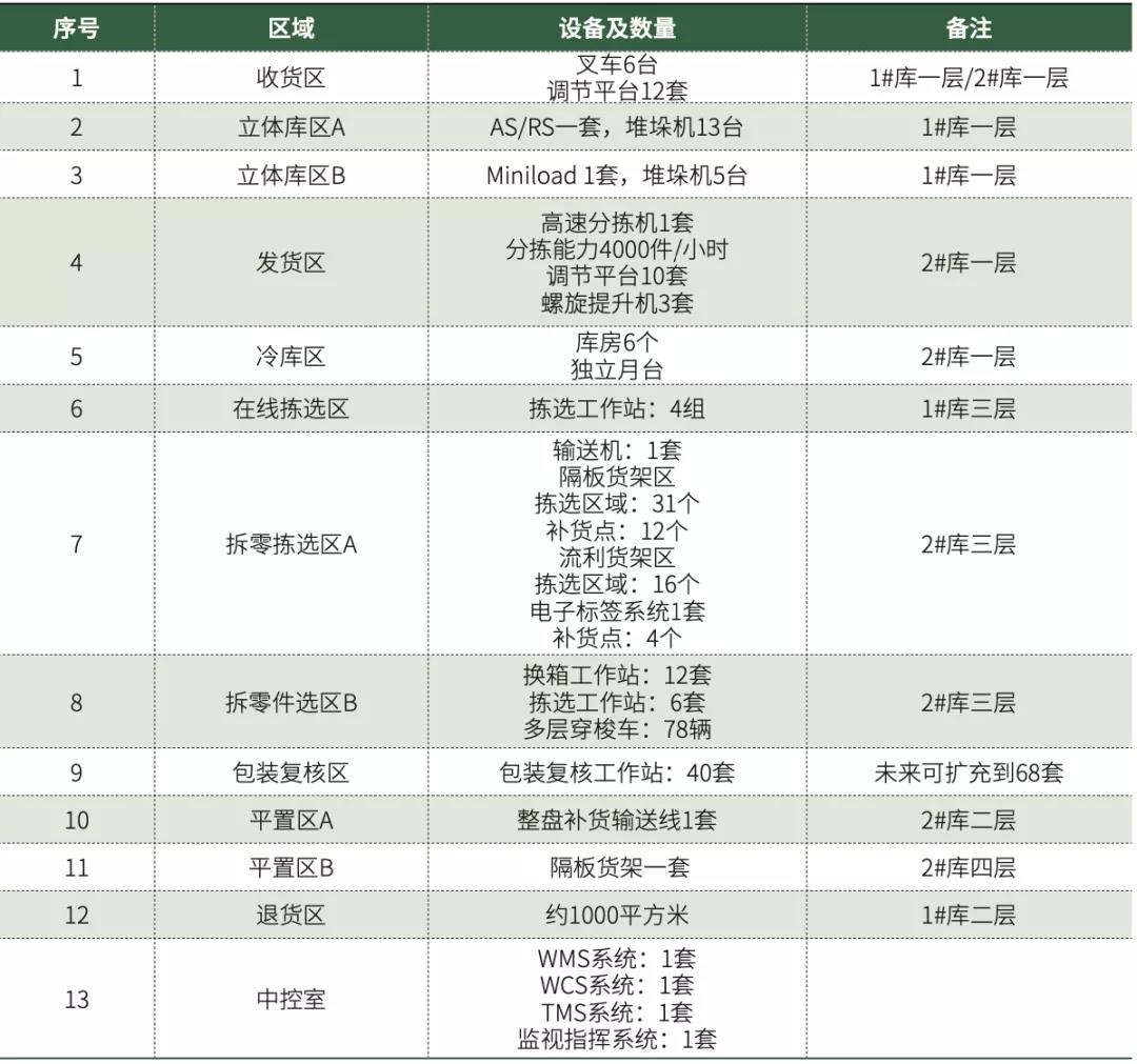 物流中心主要由两座建筑构成,其中1#仓库为一座自动化立体库,占地面积约1.2万平方米,建筑高度为24米,为单层建筑,局部为四层,共设计13巷道的AS/RS立体库1套,托盘货位2.5万个;5个巷道Miniload箱式立体库1套,储存货位约5万个。