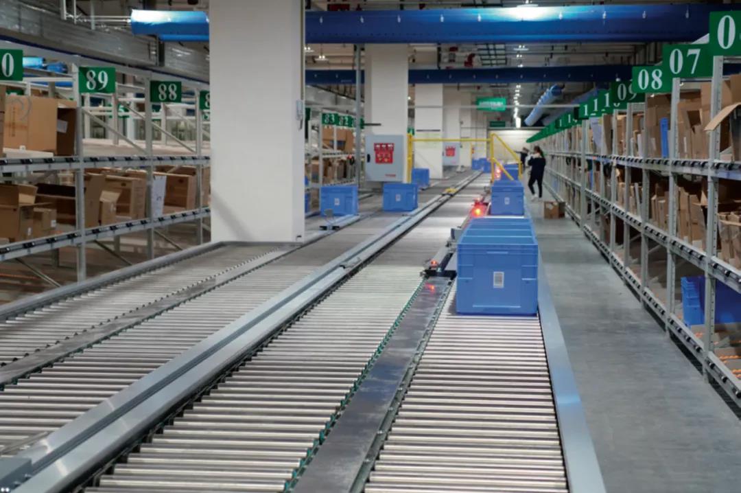 打包复核作业区负责所有拣选周转箱的打包复核。复核后的箱子(纸箱或周转箱)通过输送机进入一楼分拣机分拣。