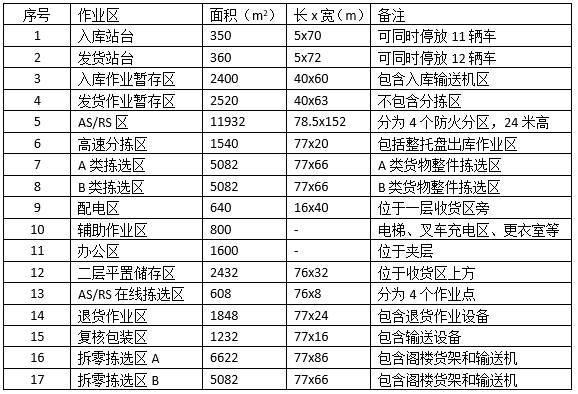 物流中心一层设置了入库区、自动化立体库、A类拣选区、B类拣选区、自动分拣区、发货区,二层为平置作业区、在线拣选区、拆零作业区、拆零复核区、退货处理区,详见表1。