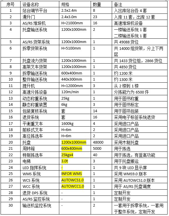 自动化立体库使用了16台堆垛机,共有49088个货位。物流中心内部同时使用了托盘输送系统、整件输送系统、拆零输送系统、提升机、高速分拣设备、动态称重系统、静态称重装置、托盘流力货架、高架叉车货架、特制拣选车等相关设备,并且设置了包装复核系统、退货系统,详见表2。