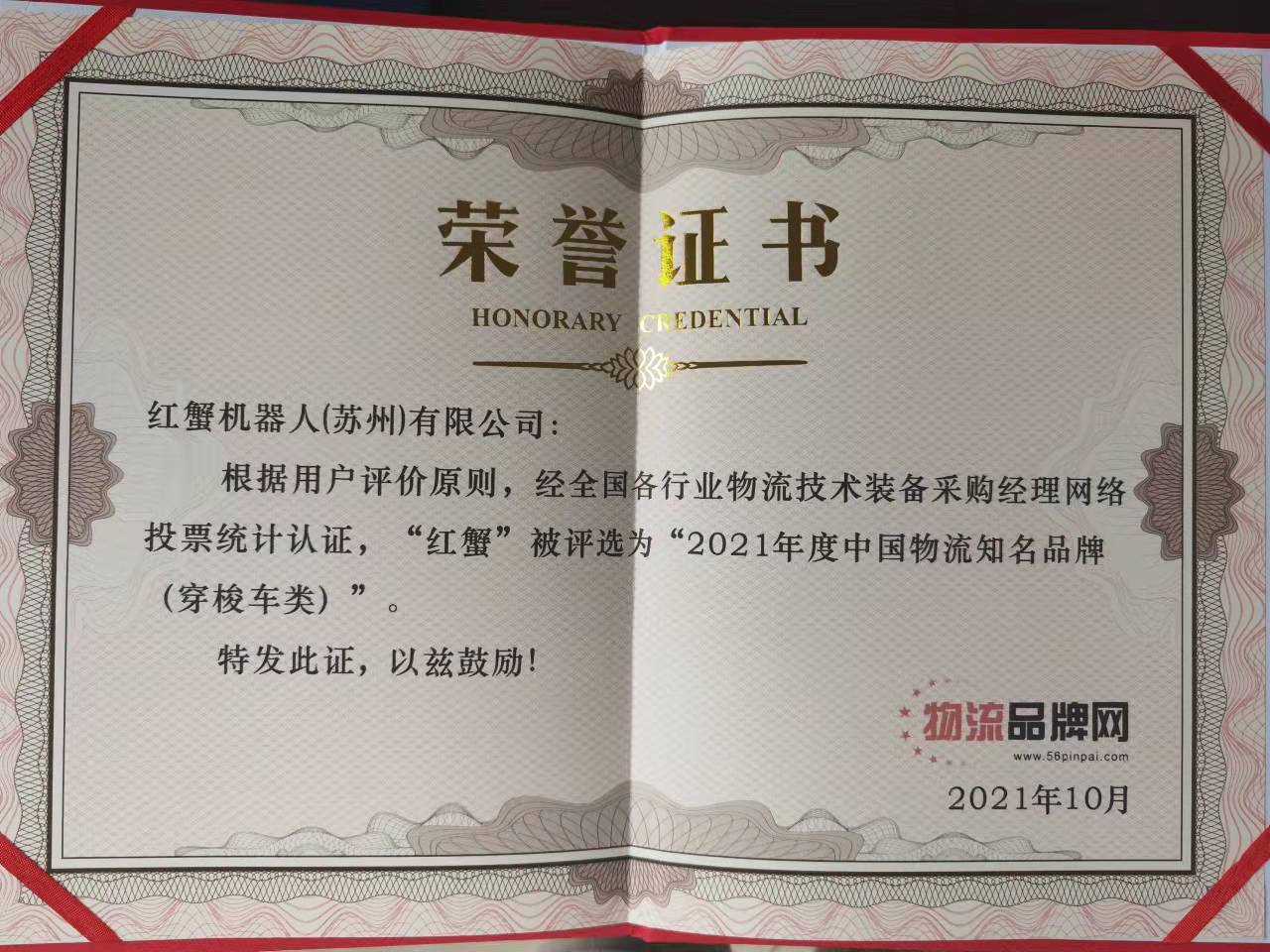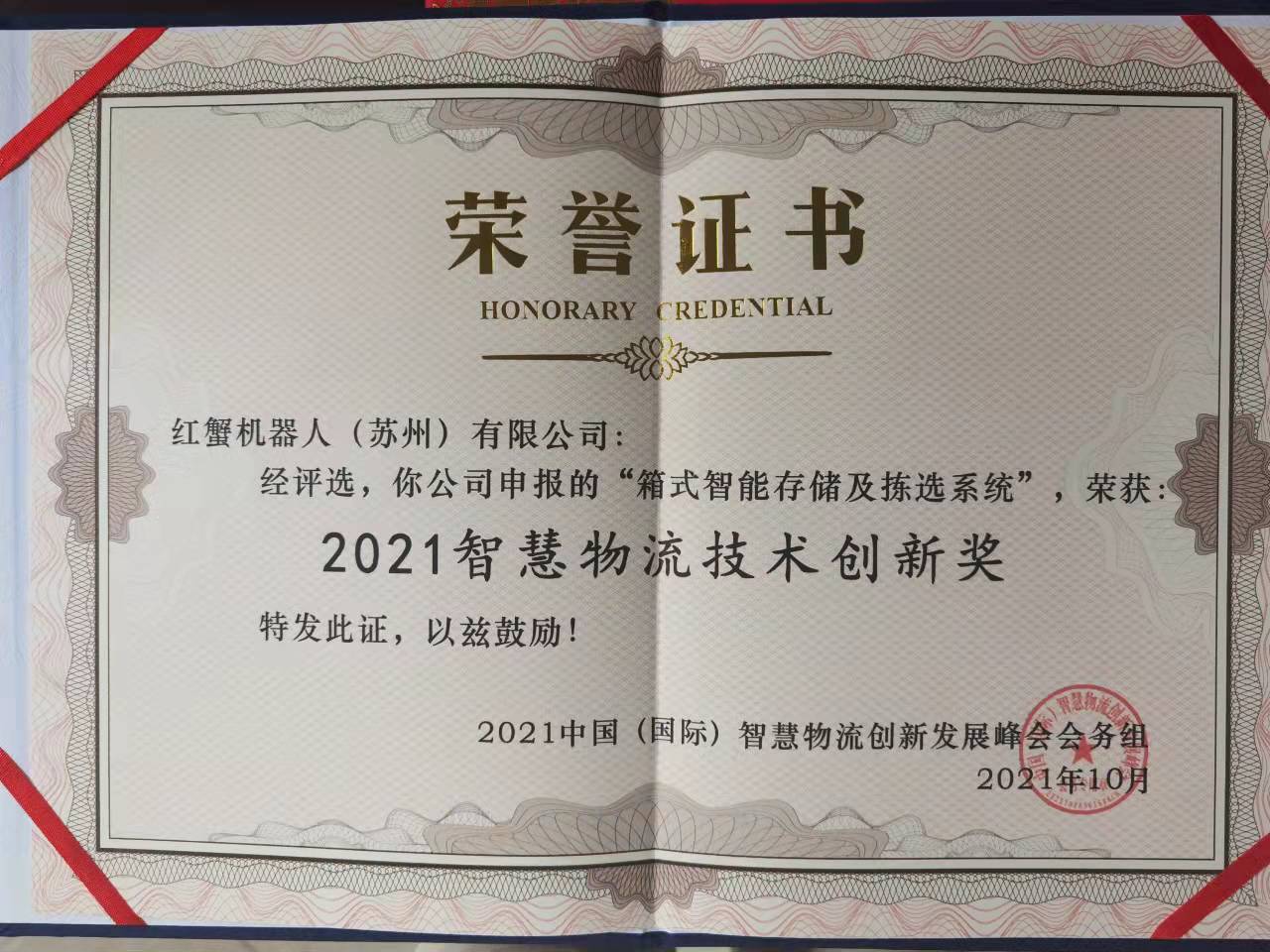 红蟹凭借优秀的创新技术获得“2021智慧物流技术创新奖”和“2021中国物流名牌奖”。
